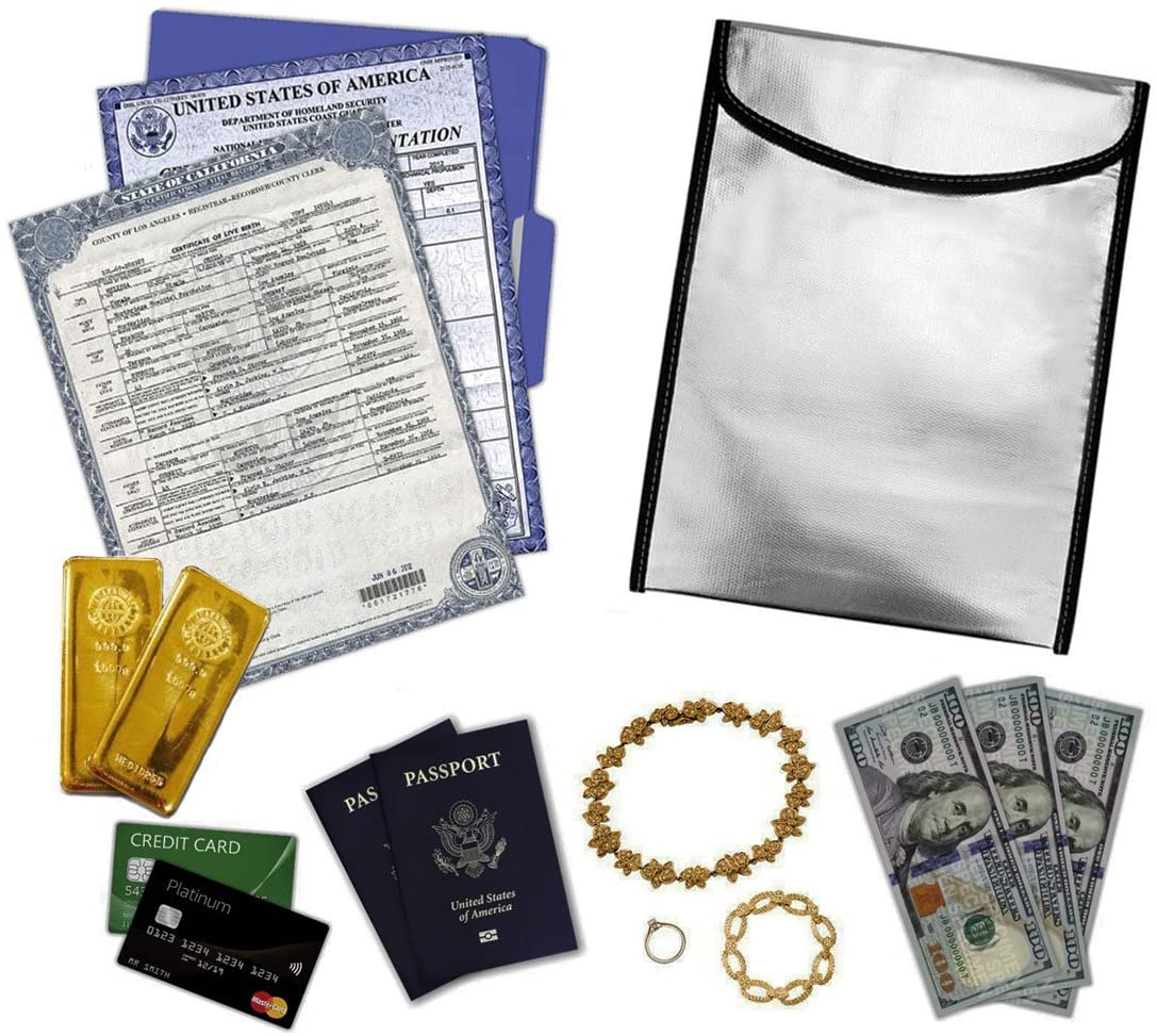 SAFTY:Best Choice as Gifts.This ireproof document bag use Two Sided Aluminum Foil Coated to protect your valuables such as documents, folders, cash, jewelry, photos, Lipo battery and any other valuables prevent damage effectively.